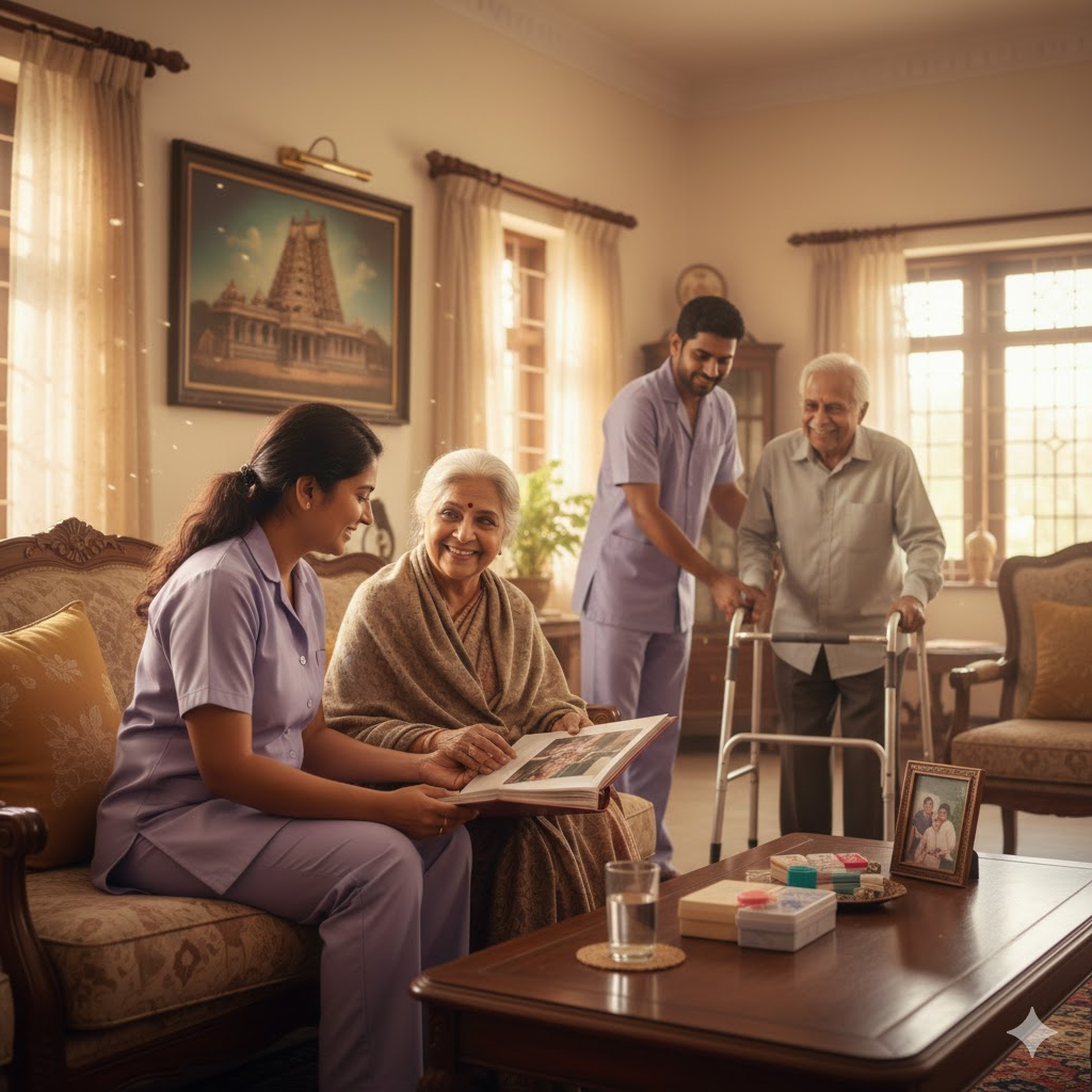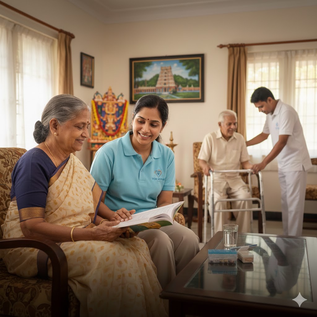 At Veni Home Care Service, we understand that elders deserve compassionate, professional, and reliable care. Our trained and verified caregivers provide personalized elder care at home in Coimbatore and nearby areas, ensuring comfort, safety, and dignity for your loved ones.